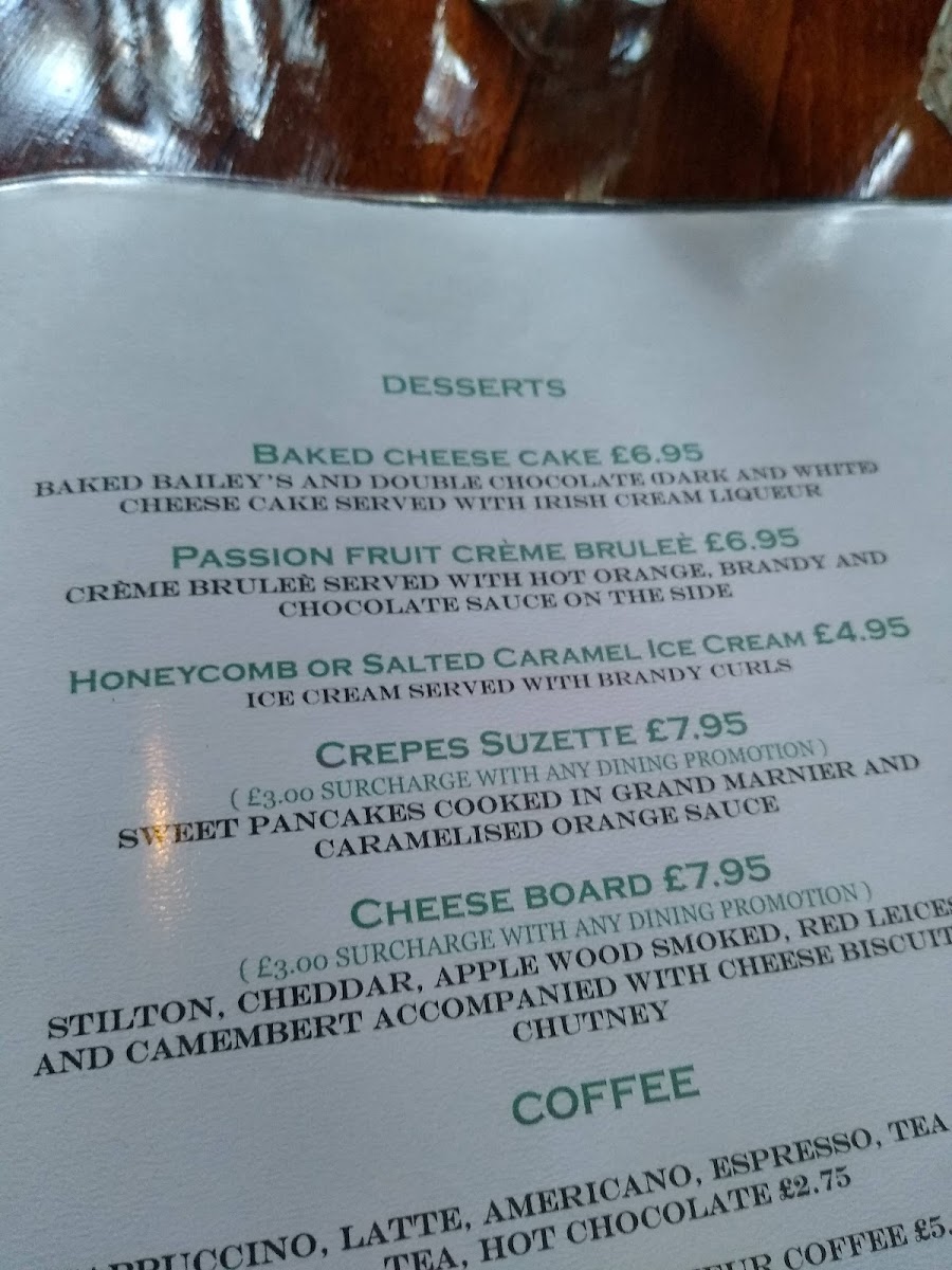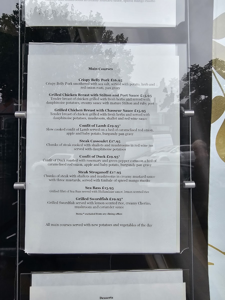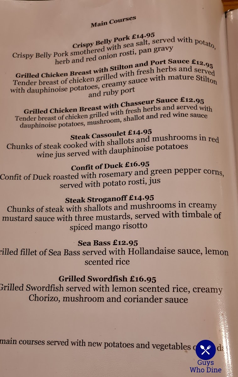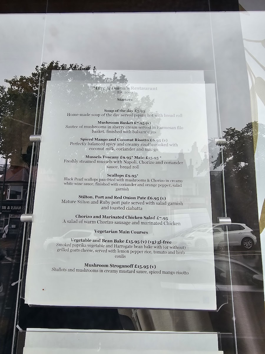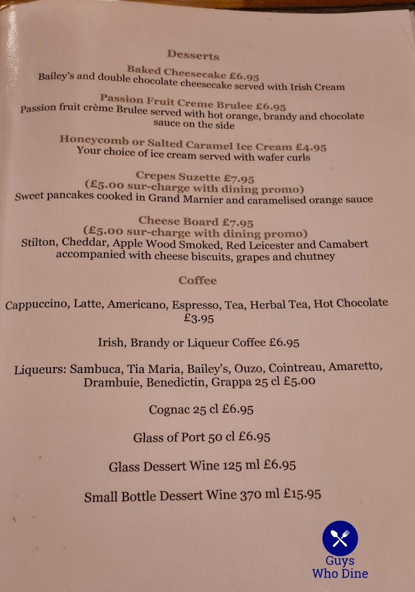 From a reviewer’s perspective, the menu at Marc & Daina’s Restaurant offers a well-rounded and thoughtfully curated selection that balances comforting classics with more refined dishes. The starters, such as Soup Of The Day, Mushroom Basket, Spiced Mango And Coconut Risotto, Mussels Tuscany, and Scallops, provide a strong and varied introduction, catering to both traditional and more adventurous tastes. Vegetarian diners are well considered with options like Vegetable And Bean Bake and Mushroom Stroganoff, while the main courses stand out with hearty and flavorful choices including Crispy Belly Pork, Grilled Chicken Breast With Stilton And Port Sauce, Grilled Chicken Breast With Chasseur Sauce, Steak Cassoulet, and Confit Of Duck. To finish, desserts such as Baked Cheesecake, Passion Fruit Creme Brulee, Honeycomb Or Salted Caramel Ice Cream, Crepes Suzette, and Cheese Board offer a satisfying and indulgent end to the meal, complemented nicely by coffee selections like Cappuccino, Irish, Cognac, Glass Of Port, and Glass Dessert Wine. Overall, the menu feels cohesive, comforting, and pleasantly varied, leaving a positive final impression.